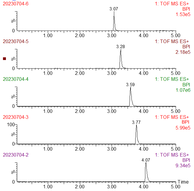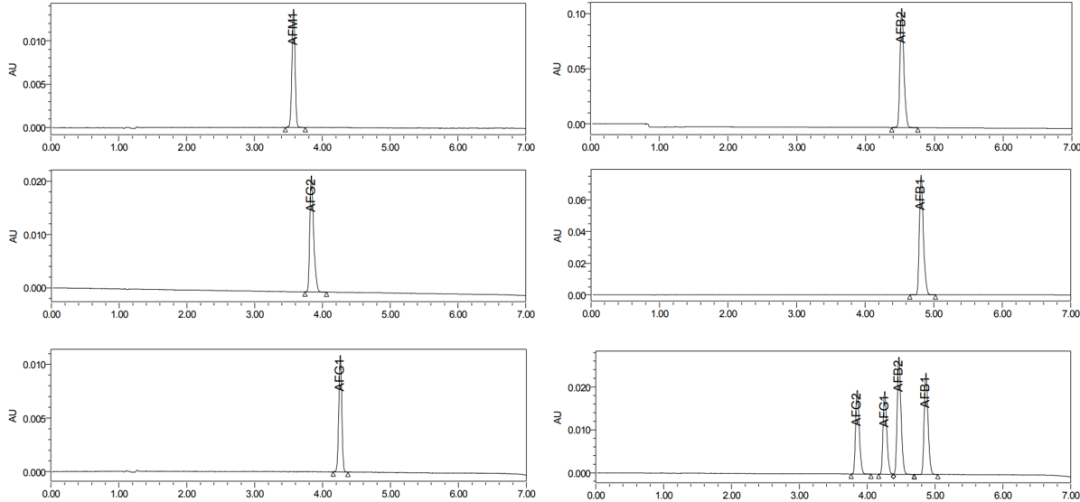 5种黄曲霉毒素全13C同位素内标产品及1种混合标准品的UHPLC分析图谱