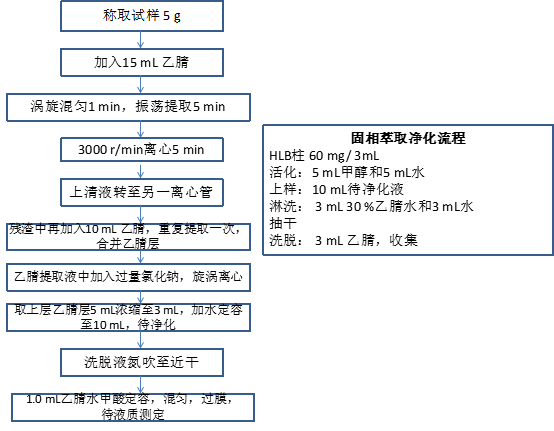 2.本方法使用乙腈分两次提取目标化合物,加盐净化后,再使用HLB柱进行富集净化,相当于1 g试料进行上机检测。